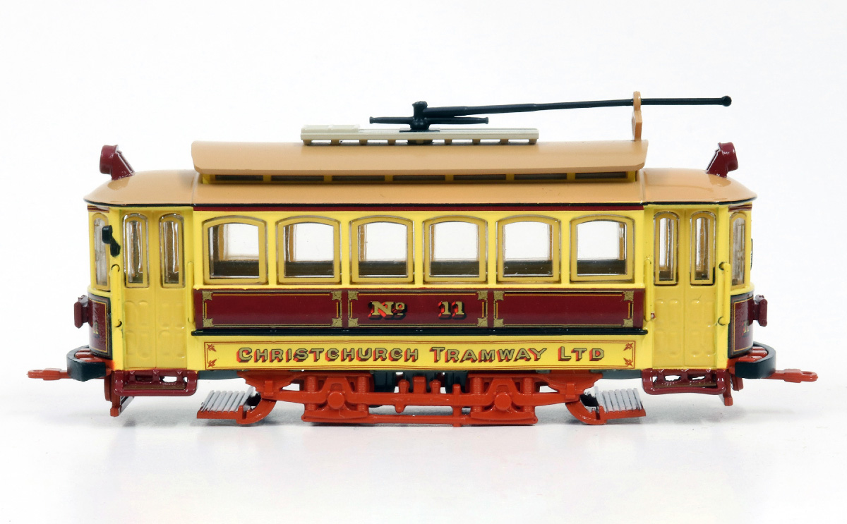 Box Car No. 11 operated as a passenger service at Ferrymead Heritage Park until 1994 when she was withdrawn, further refurbished, and set up to operate on Christchurch’s central city tramway. The original Dunedin City Corporation insignia was replaced with Christchurch Tramway insignia in similar Edwardian style, as evidenced on the model. Christchurch locals and visitors alike are delighted to be able to experience travelling around Christchurch’s city streets inside Box Car No. 11, New Zealand’s oldest operating tram.